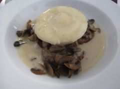 Œuf poché sur son croûton toasté et aillé, ses champignons de Paris frais